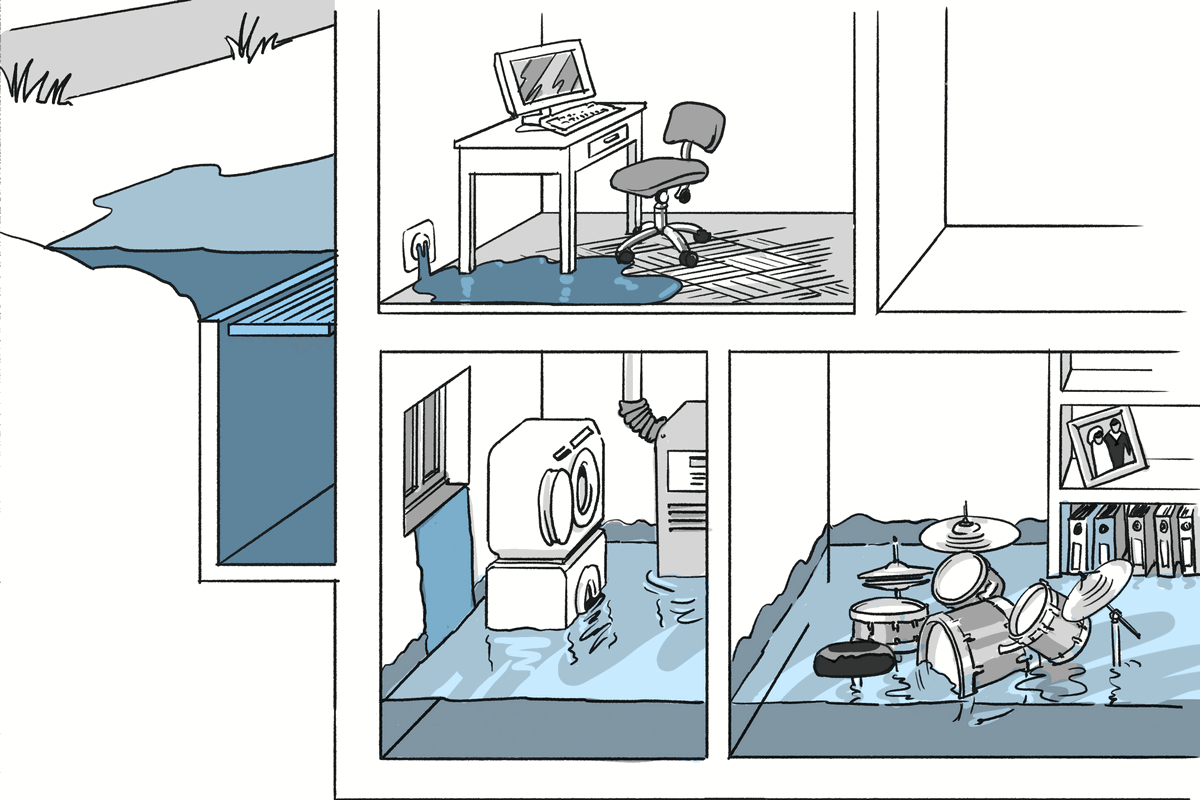 Toujours à la recherche du point le plus bas, l'eau s'accumule dans les dépressions et malheureusement aussi dans les caves et les garages souterrains non protégés, où elle peut y causer de sérieux dégâts et mettre les personnes en danger de mort. Seuls 20-30 cm d’eau suffisent déjà pour que les portes ne puissent plus s’ouvrir et que des personnes restent enfermées. De plus, les fenêtres et les portes peuvent soudainement céder sous la pression croissante de l'eau et des pièces entières peuvent se retrouver inondées en quelques secondes.